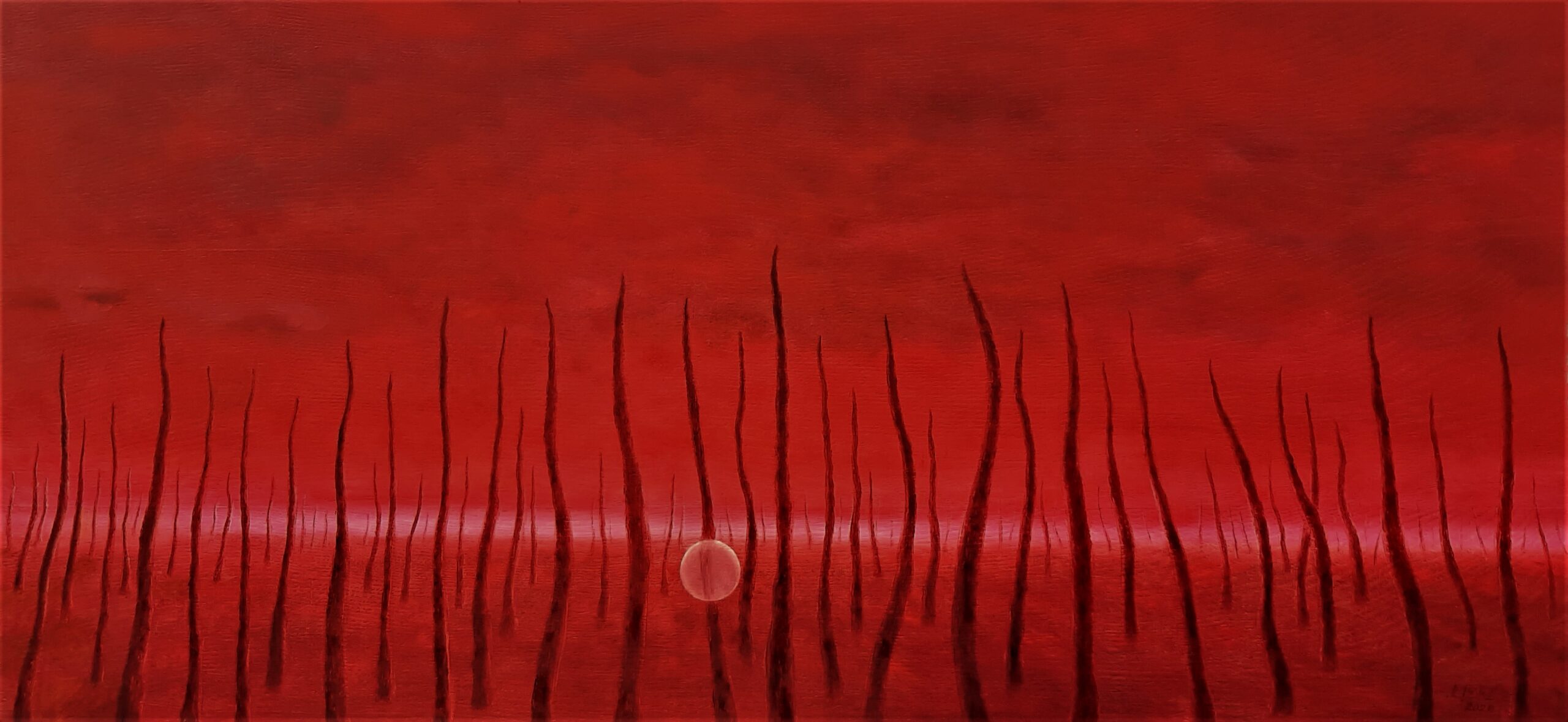 Im Jahr 2020, als die Covid 19 Pandemie ausbrach und die ganze Welt gefangen hielt, malte ich diesen Geisterwald. Das Leben stand still, und die von Menschen bewohnten „Betonwäldern“ waren leer und gespenstisch…