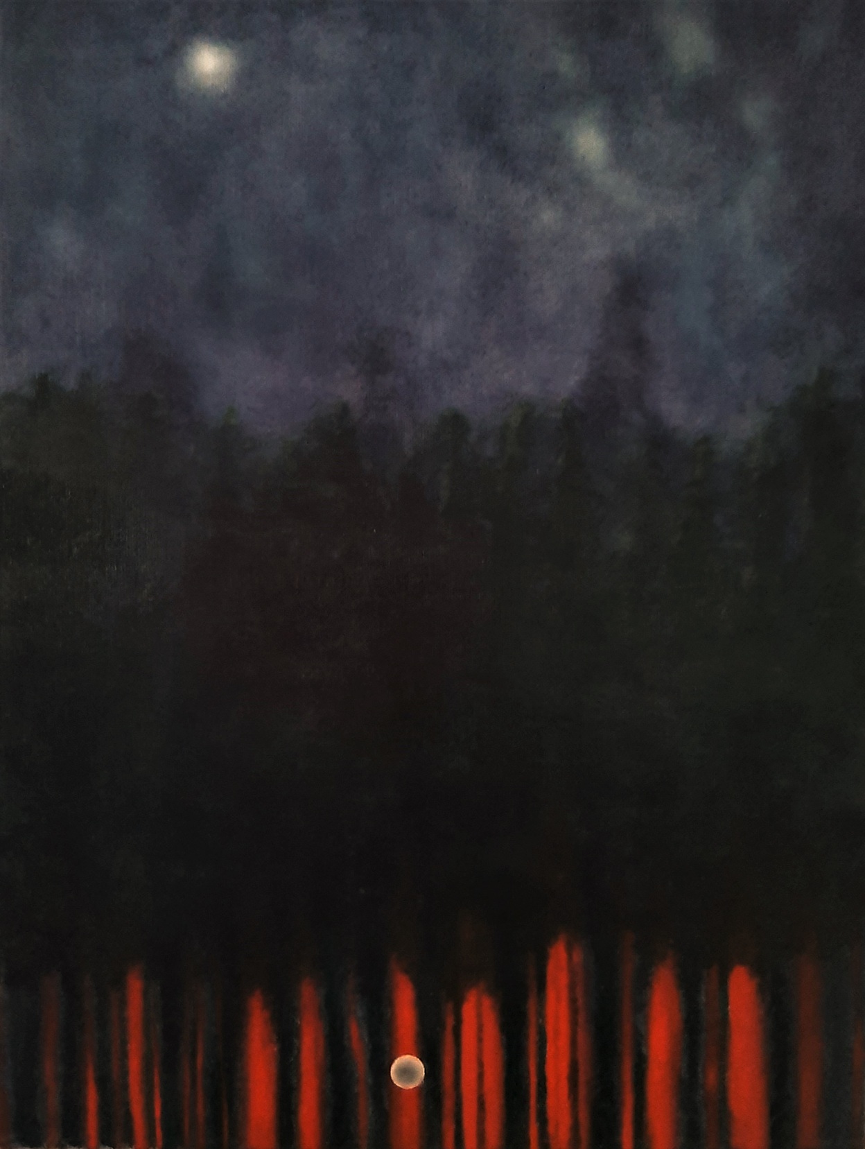 Der Wald wie die Nacht birgt viele Geheimnisse. In dem wirklichen Wald leben viele Tiere, große und kleine, Raubtiere und Beute, und im Wald meiner Künstlerfantasie leben die Gnomen, Feen, Elfen, Hexen, Kobolde und auch Monster, die uns beobachten und auf der Laue sind…